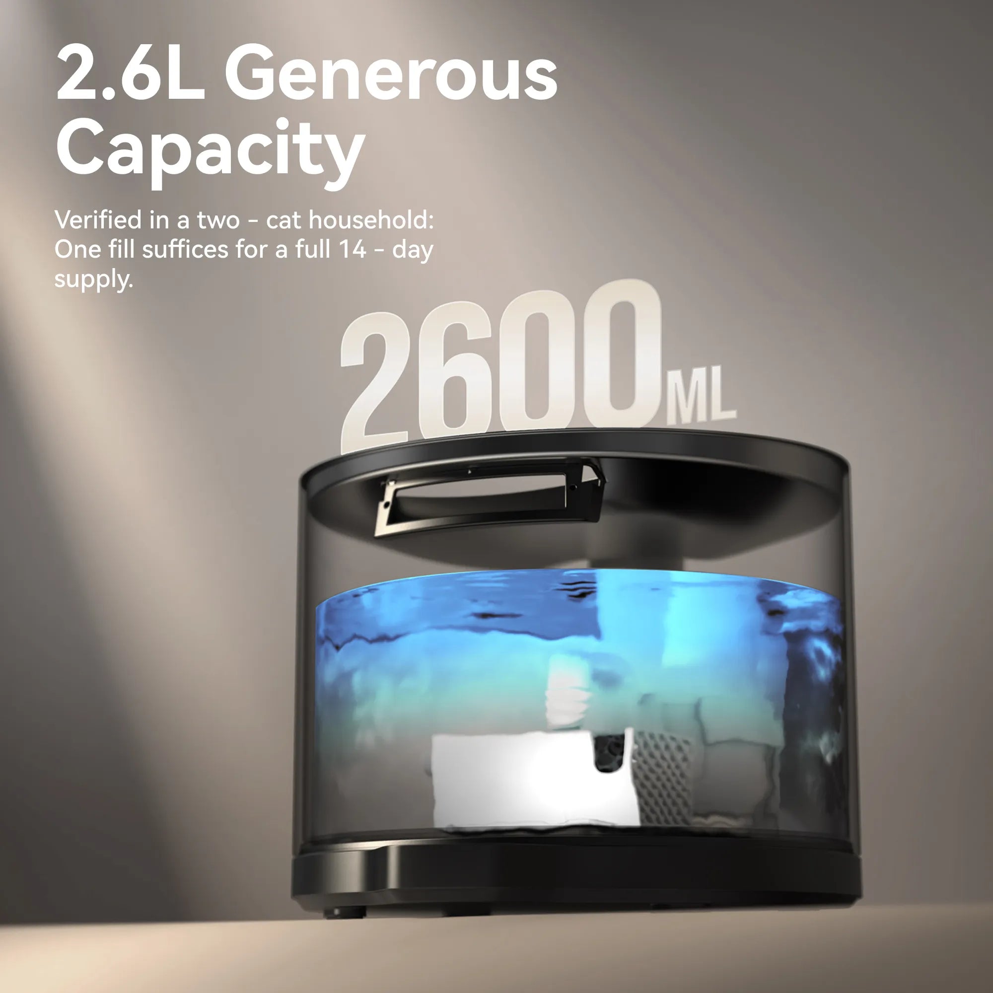 - Between the 2.6L water fountain, the feeder’s 4L food capacity, and the Open-X’s 12L waste drawer, your cat stays well-fed, hydrated, and clean for 14 days, ideal for short trips or long workdays.