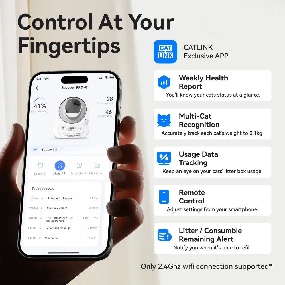 Meet CATLINK Scooper Luxury Pro-X: The self-cleaning litter boxdesigned for busy families who crave simplicity and more quality time together. Unlike other automatic cat litter boxes, we prioritize effortless cleanliness with 4-stage odor control to keep your home truly fresh, and a one-touch deep clean mode for hassle-free maintenance. It’s truly multi-cat ready, engineered to save you time—so you can focus on what matters most: your family, not the litter.