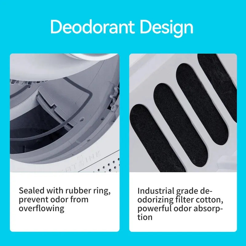 SCOOPER features an optional smart deodorizer designed to neutralize litter box odors. 2 pieces of large carbon filters located in the front of the waste drawer absorbs odors. If you empty the waste drawer and notice scooper is still a source of unpleasant odors, we recommend changing litter completely, deep-cleaning scooper twice per year, and replacing the carbon filter as needed.