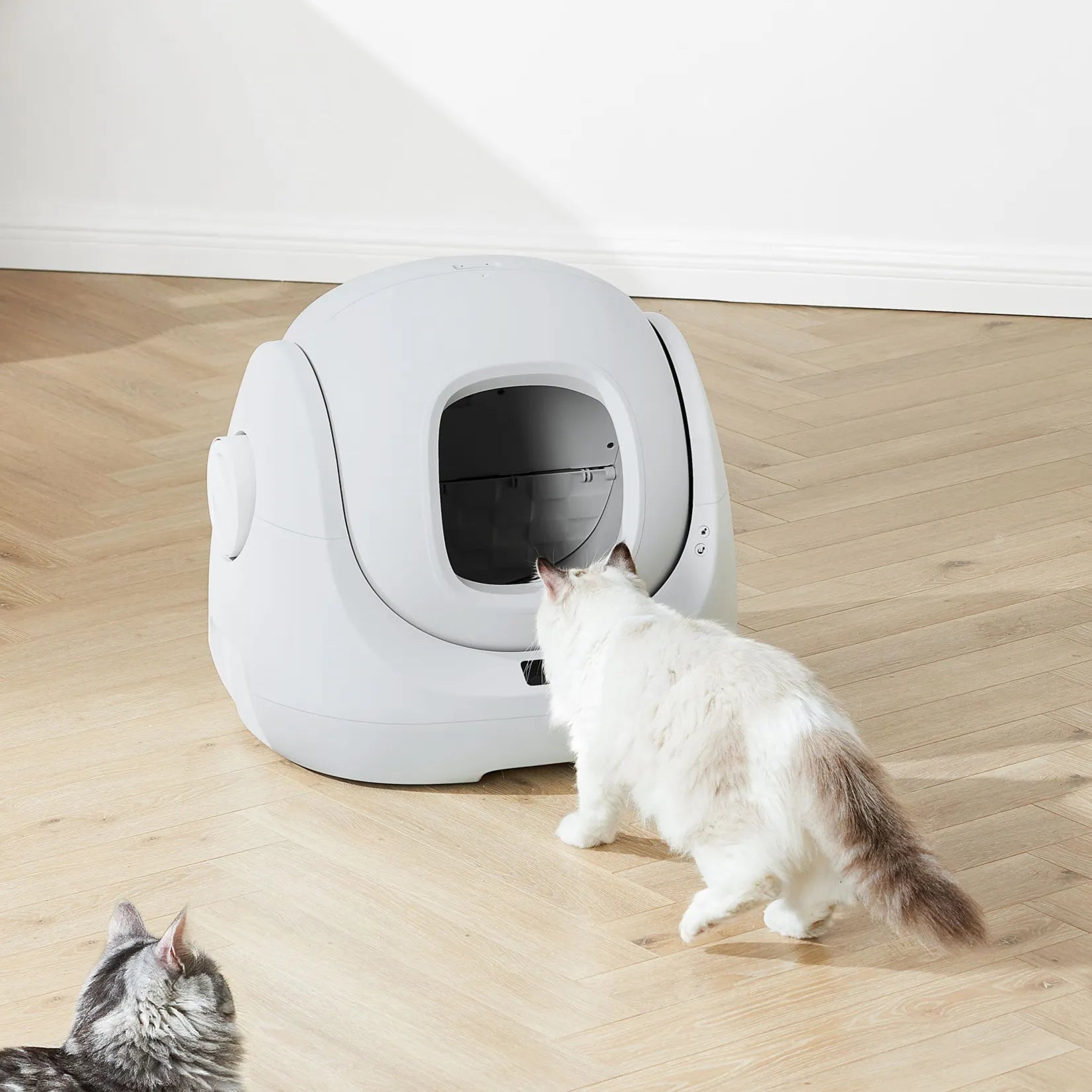 For multi-cat family. Extra large automatic self-cleaning cat litter box for multiple cats with APP control, odor control, and health monitoring.
