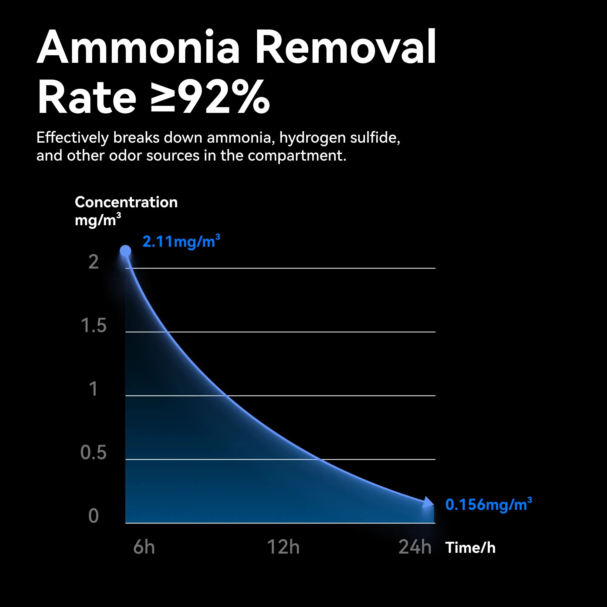 Efficiently decomposes sources of odors such as ammonia and hydrogen sulfide inside the compartment.